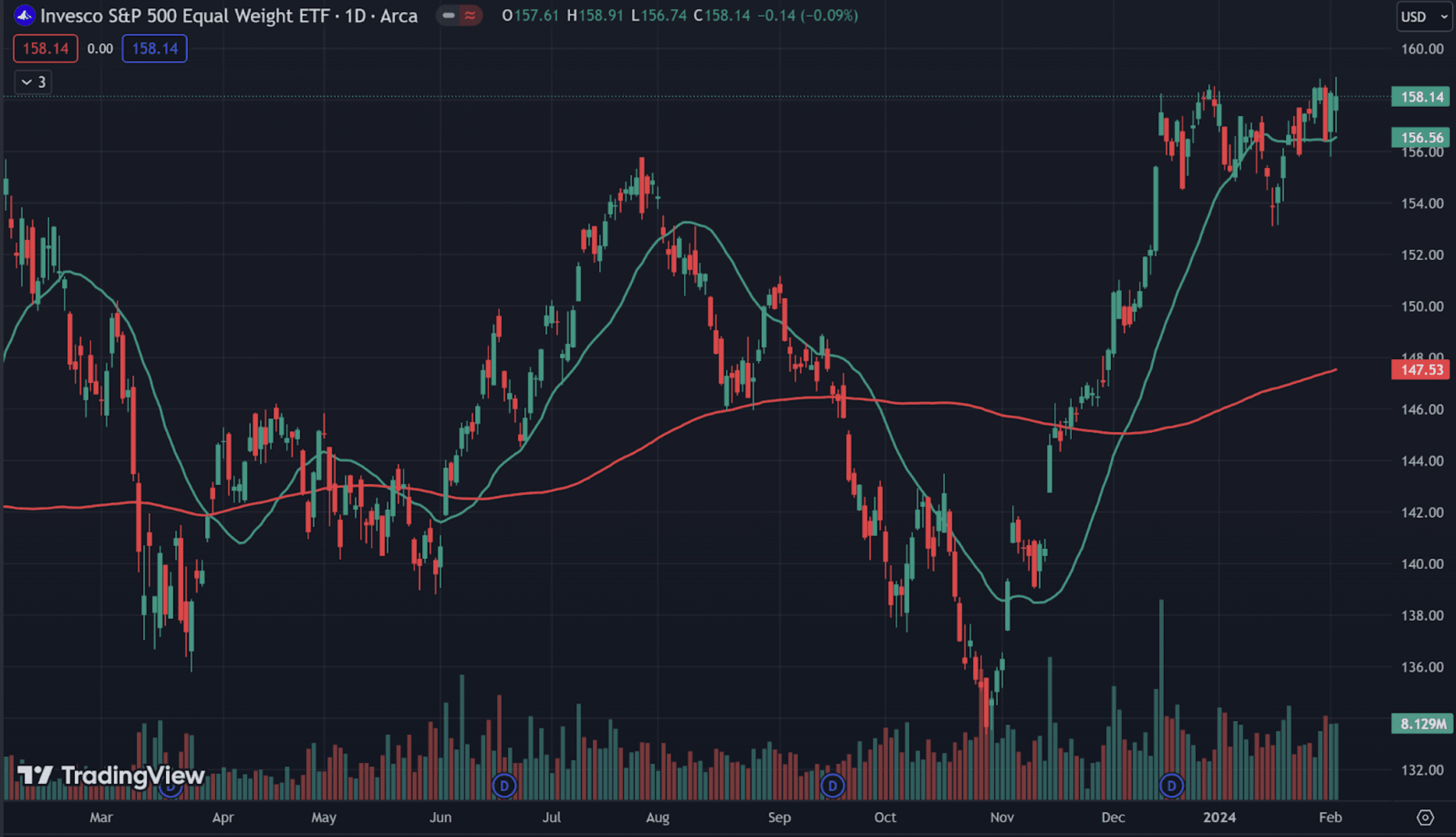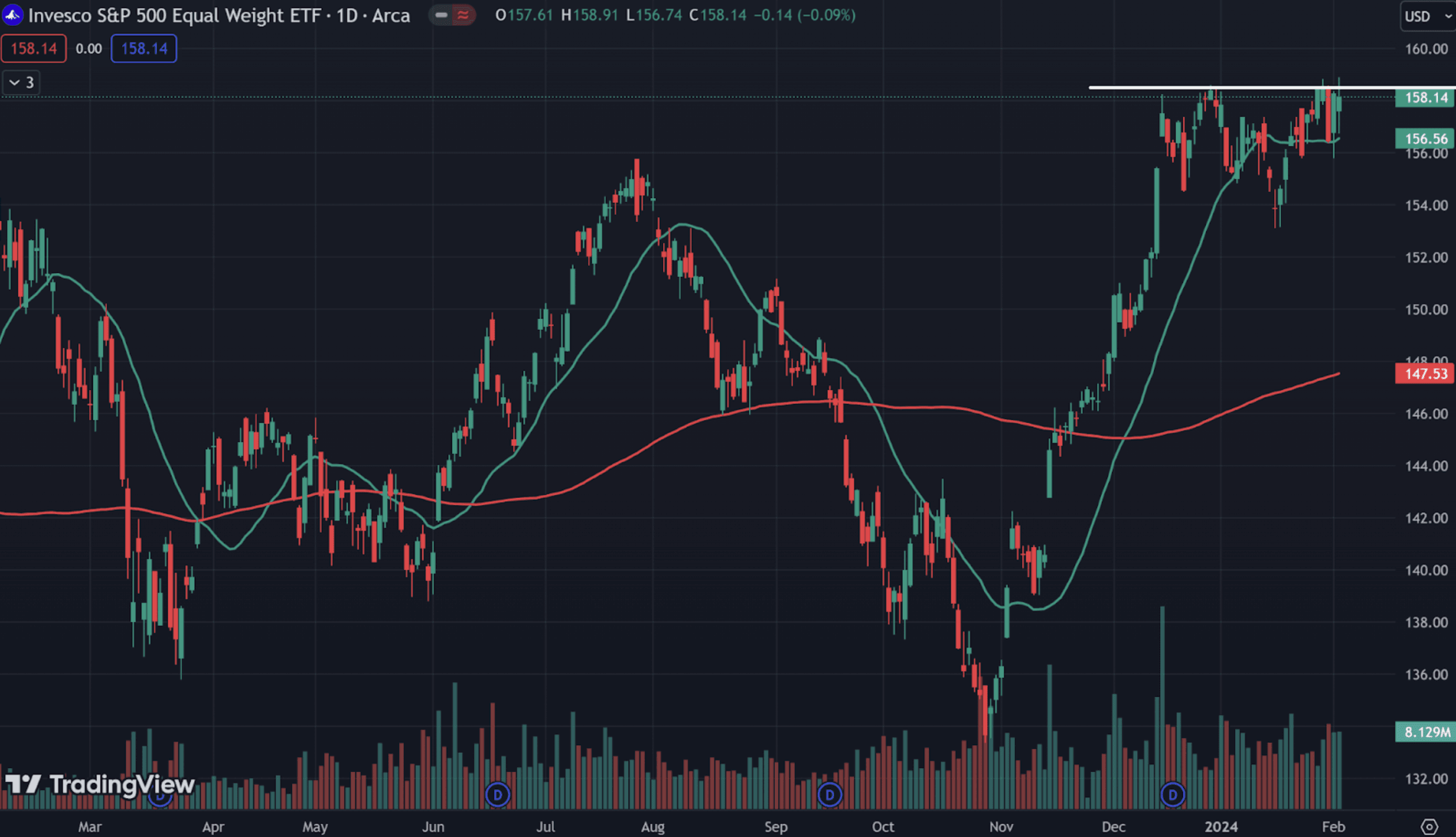 This is the Equal-Weight S&P 500 Index – which basically shows us how the S&P 500 would look if all 500 stocks were weighted equally instead of by market cap.