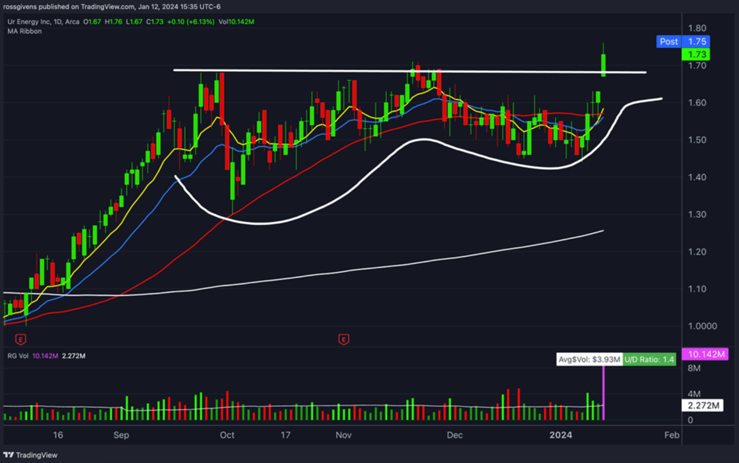 Ur Energy – like other names I’ve highlighted from this sector – also broke out on record volume last Friday.