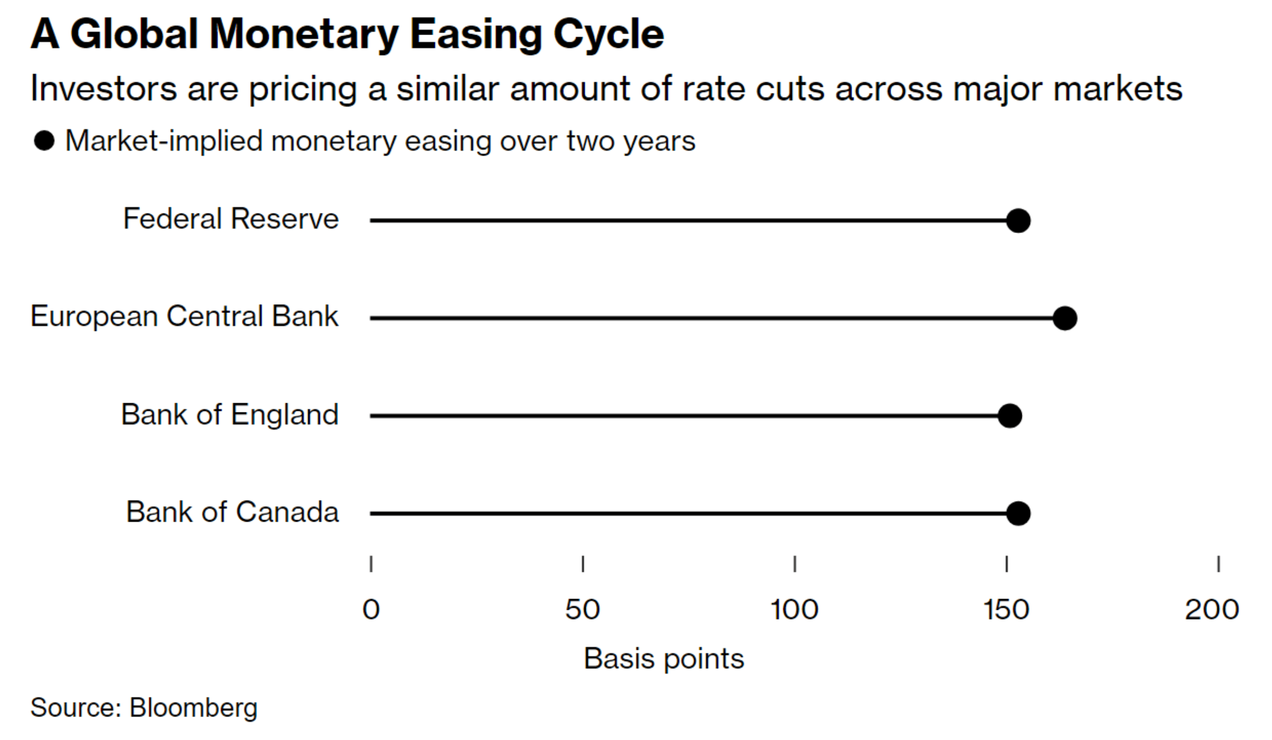 Here’s a chart from Bloomberg showing how much rate cuts investors are pricing in for the major central banks.