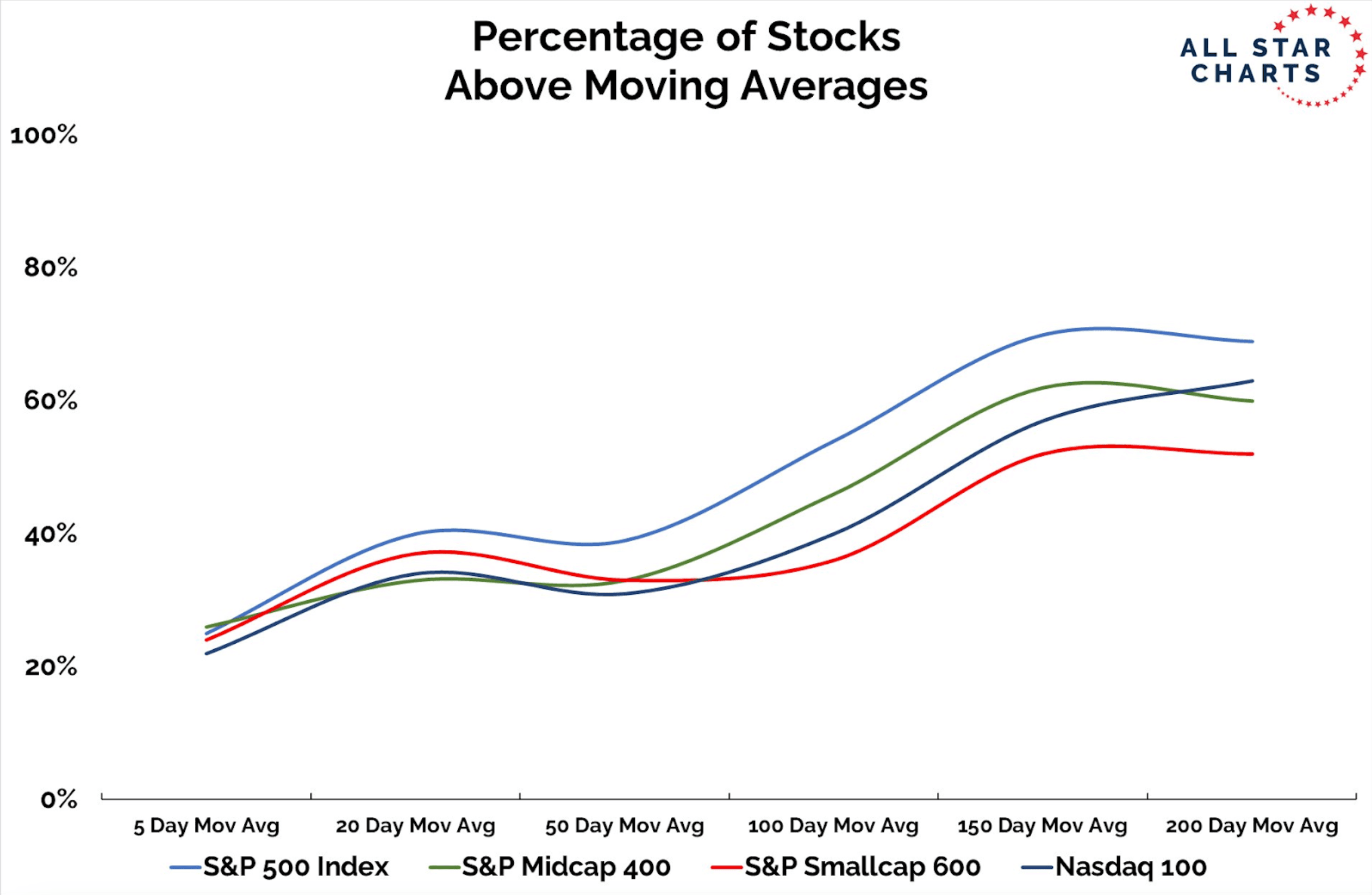 This is an interesting chart that shows the percentage of stocks above key moving averages in a single image.