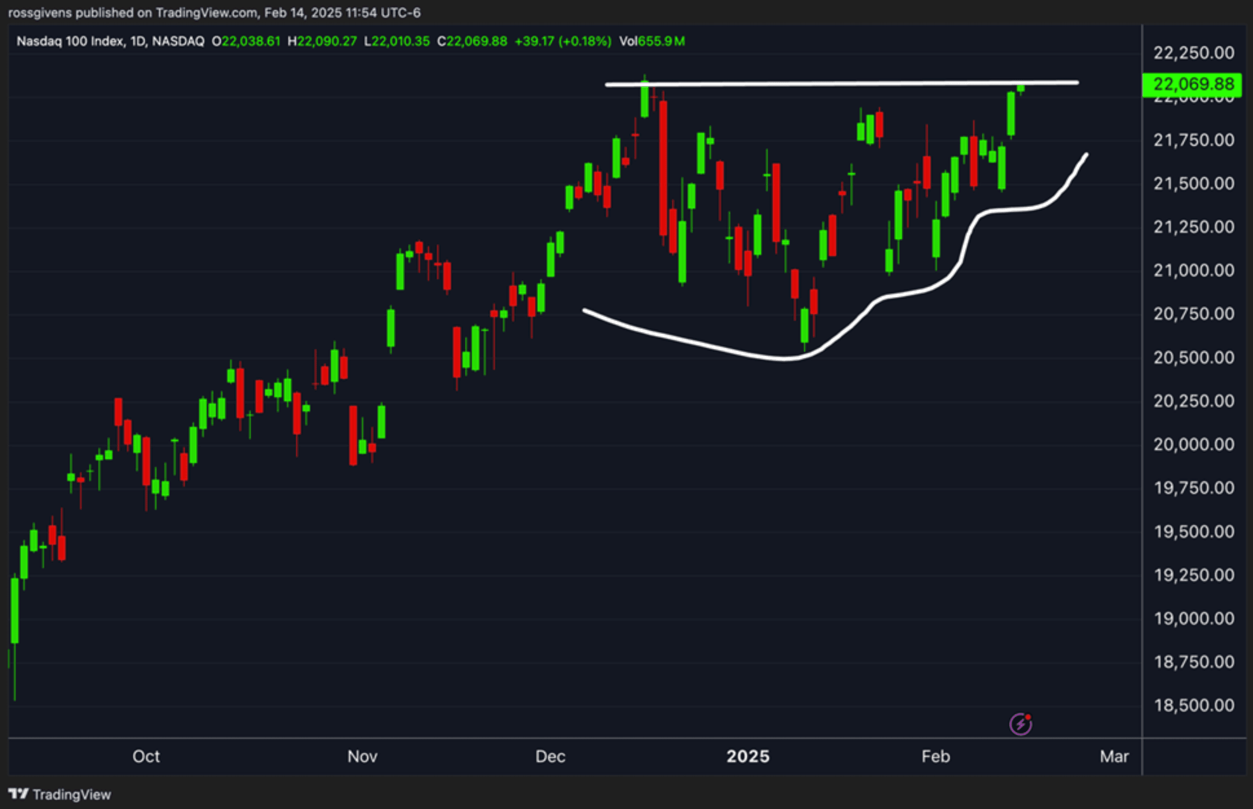 The first two charts are the S&P 500 and the Nasdaq setting up a classic breakout pattern.