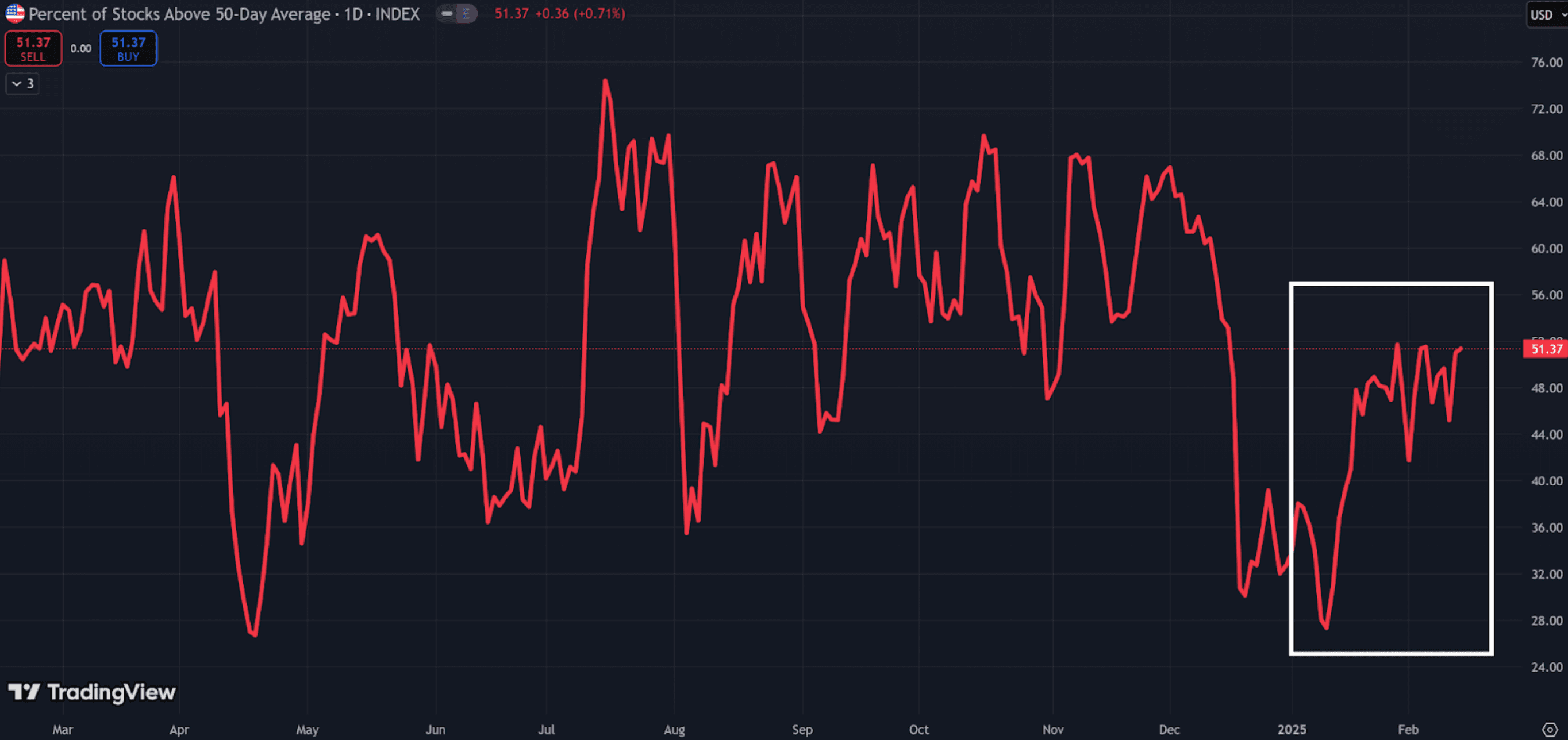 Especially when you consider how market participation is broadening – with over 50% of stocks now trading above their 50-day moving averages…
