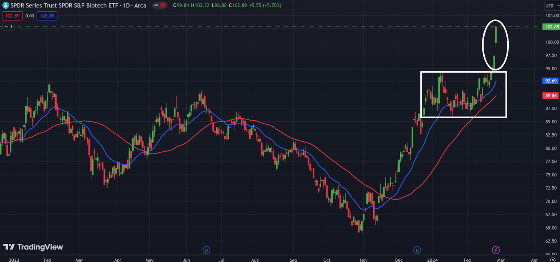 This is XBI – the S&P Biotech ETF, breaking out of a classic consolidation pattern (rectangular box).