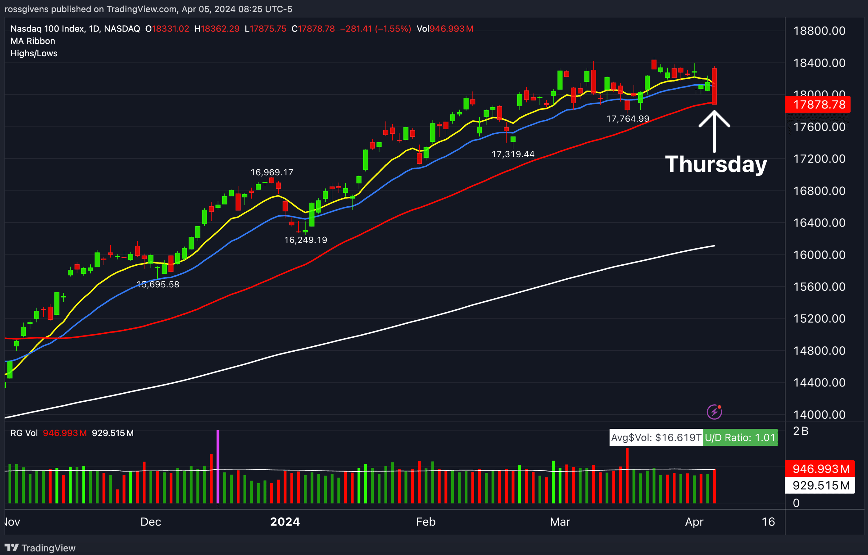 By the close, the Nasdaq was touching the 50-day moving average… the first time it has done so since November.