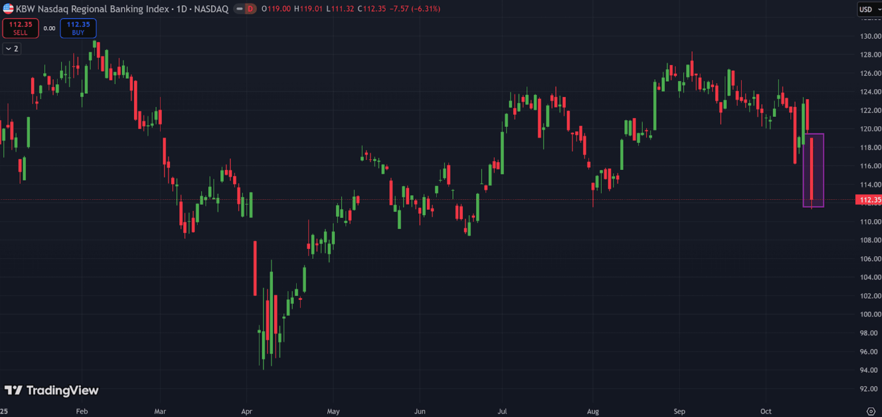 The plunge came about after two regional banks – Zions Bancorp and Western Alliance – disclosed chargeoffs related to bad and fraudulent loans.