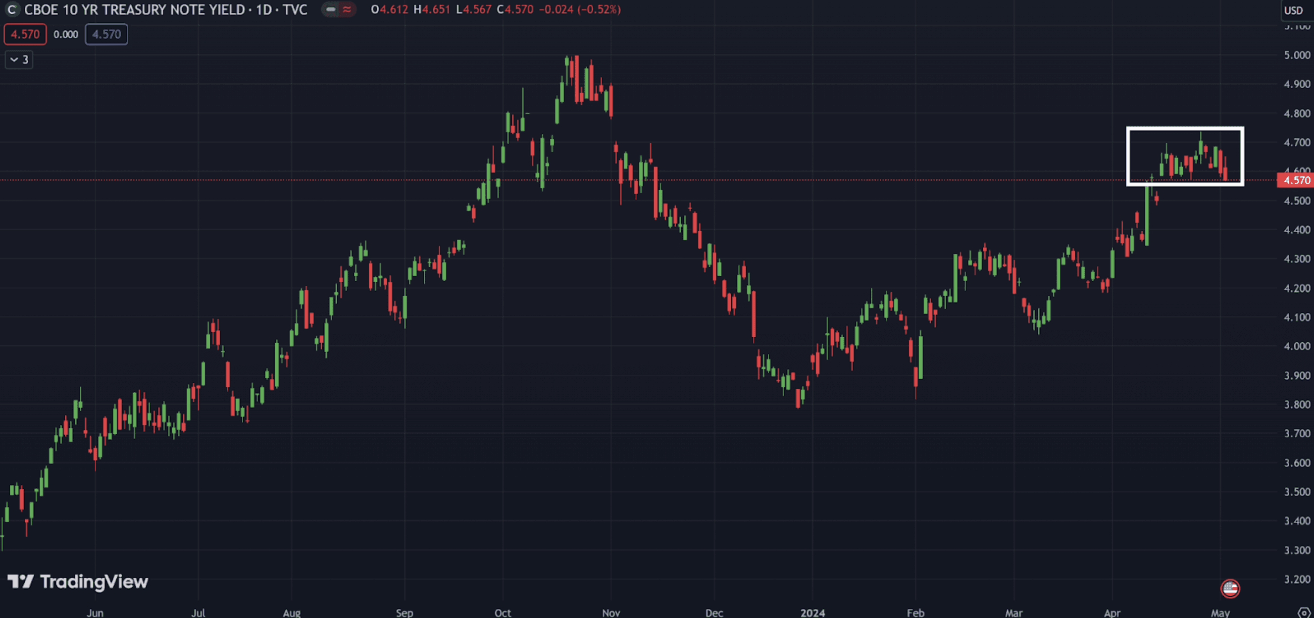 The first level is the US 10-year Treasury yield, which spiked in April and has been trading sideways in a consolidation range (white rectangular box) for the past two-and-a-half weeks.