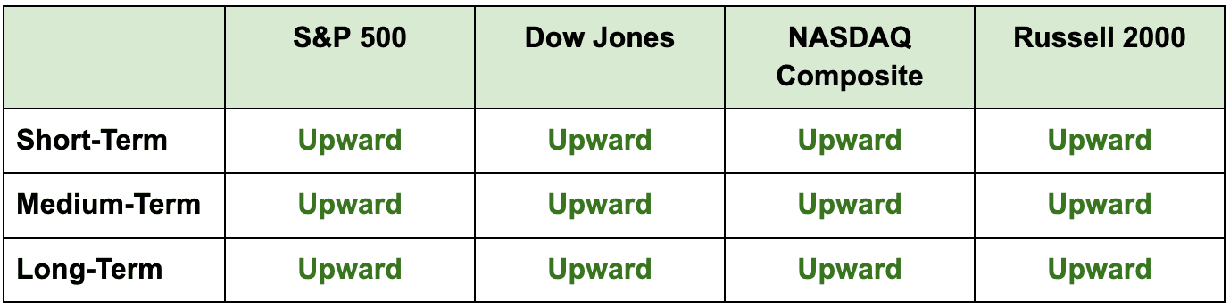 Note: All indexes except the Dow closed higher to end last week. On a weekly basis, the S&P 500 and the Nasdaq were higher while the Dow and the Russell 2000 were lower. All directions remain upward.