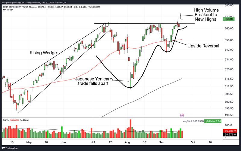 After last week’s upside reversal following the CPI report and Wednesday’s 50 basis point rate cut by the Fed, the market broke out into new high ground on heavy trading volume.