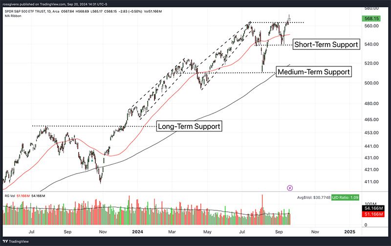Near term, I am watching the 540 level. After running up against previous highs in August, the market pulled back and found buyers here. This level, just beneath the 50-day moving average, is what I am watching to ensure the short-term uptrend remains intact.