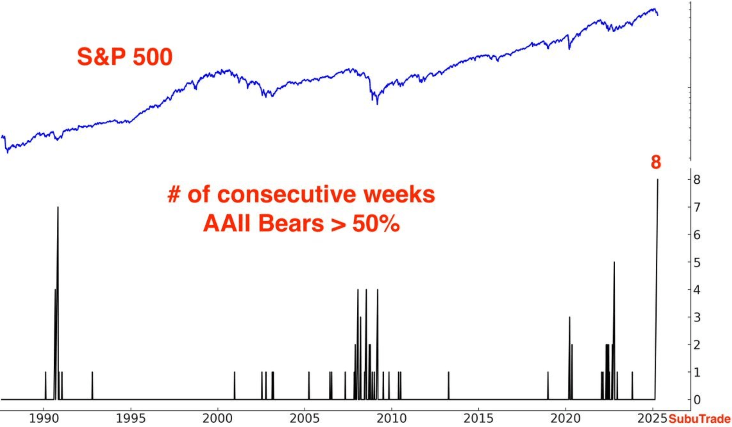 The bottom part shows the number of consecutive weeks that over 50% of respondents to the weekly market sentiment survey by the AAII (American Association of Individual Investors) were bearish.