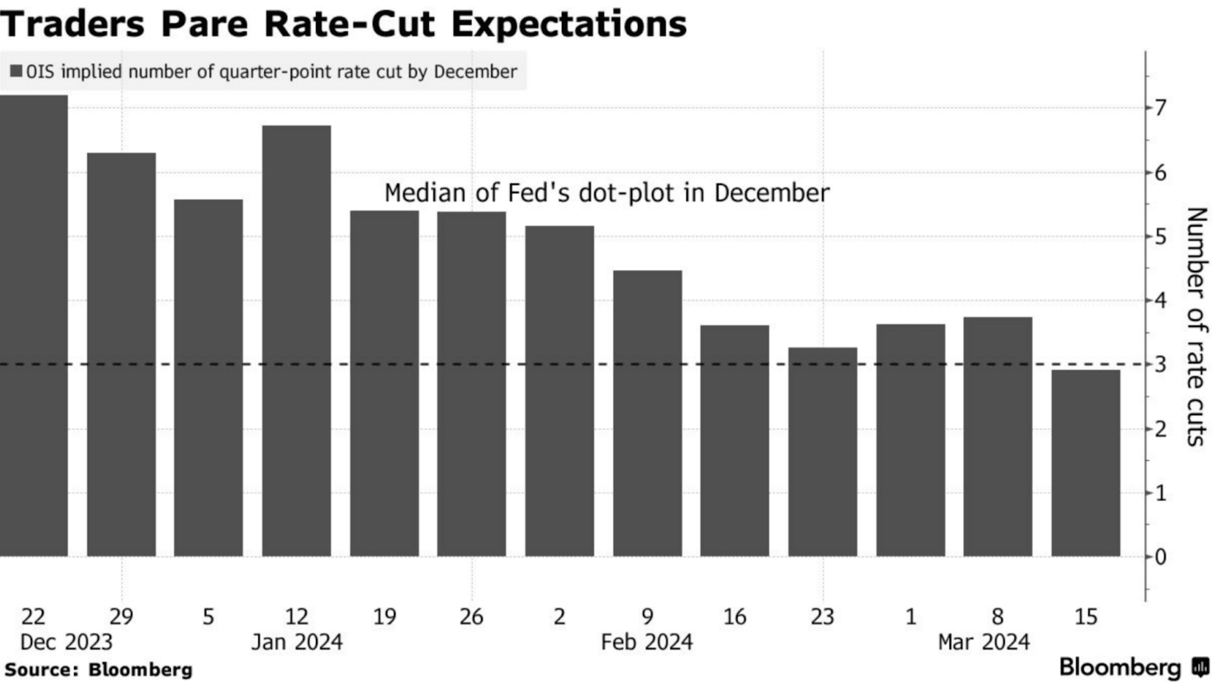 In December, markets were expecting six to seven rate cuts. Right now, it’s expecting three (which is what the Fed itself has said).