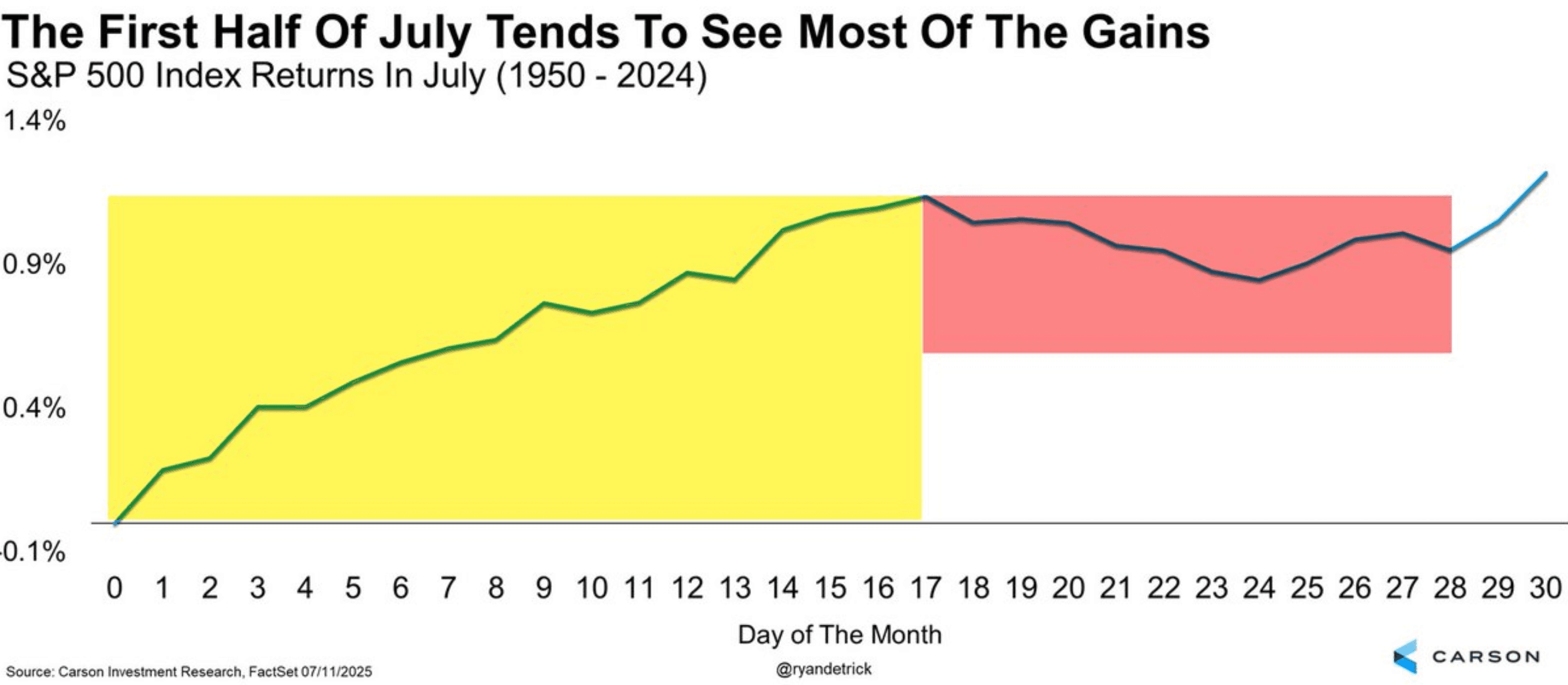 This chart shows how the S&P 500 has performed in July on average, based on data going back to 1950.