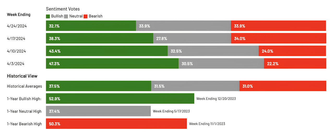 And as you can see, bullish sentiment fell steadily throughout the month, from 47.3% on April 3 to 32.1% on April 24.