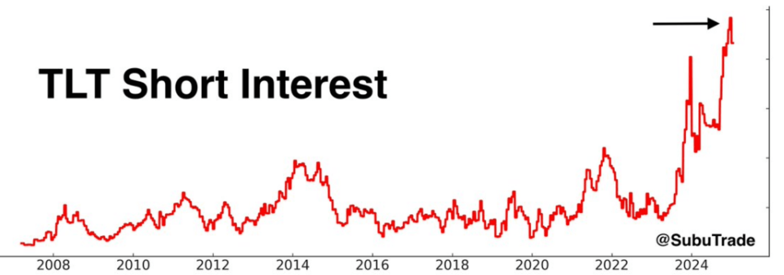Here’s another interesting chart – the level of people shorting the Treasury bond market (aka expecting yields to rise further) is the highest in years.