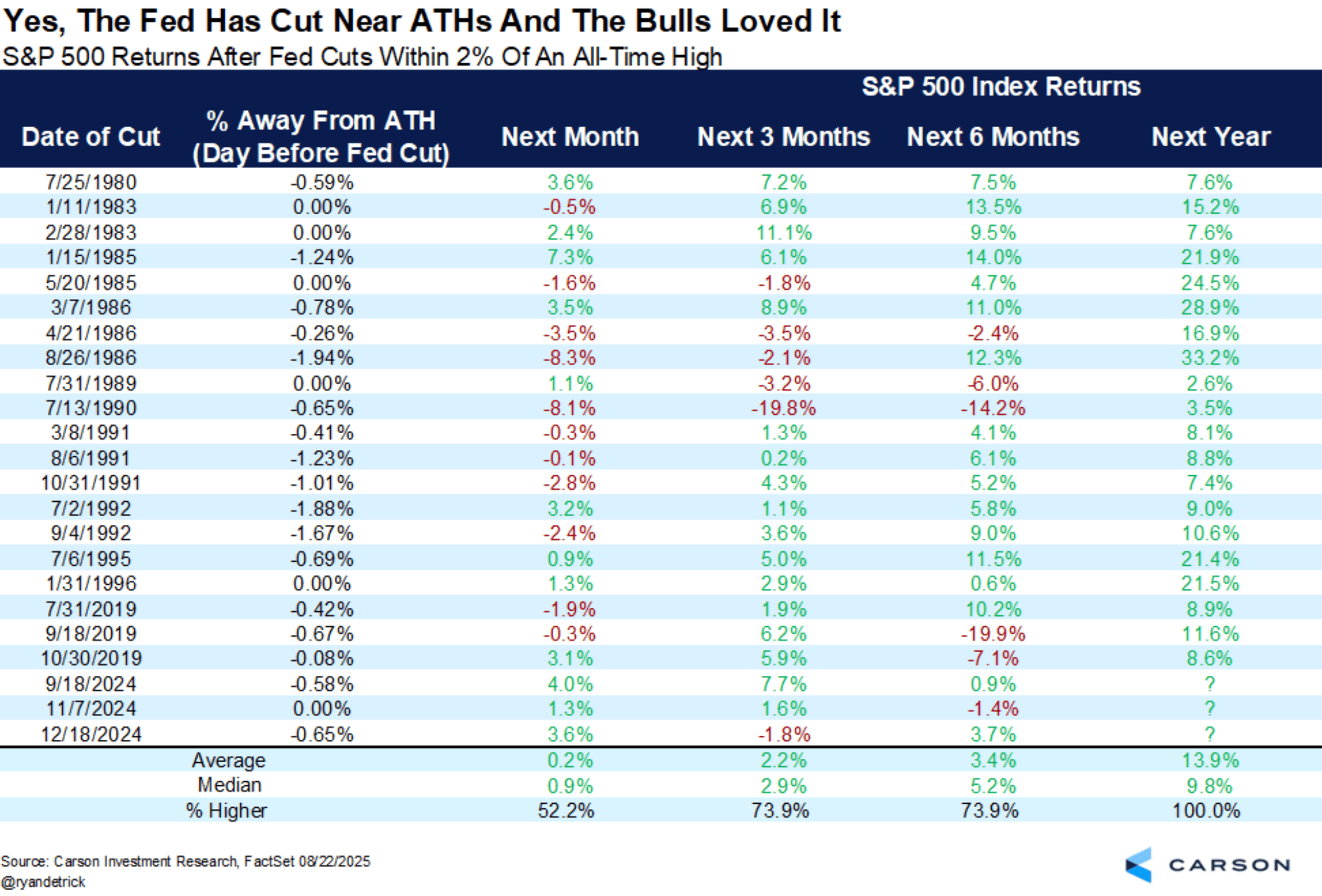 This table shows how the S&P 500 has performed across various timeframes every time the Fed has cut while the market was near all-time highs.