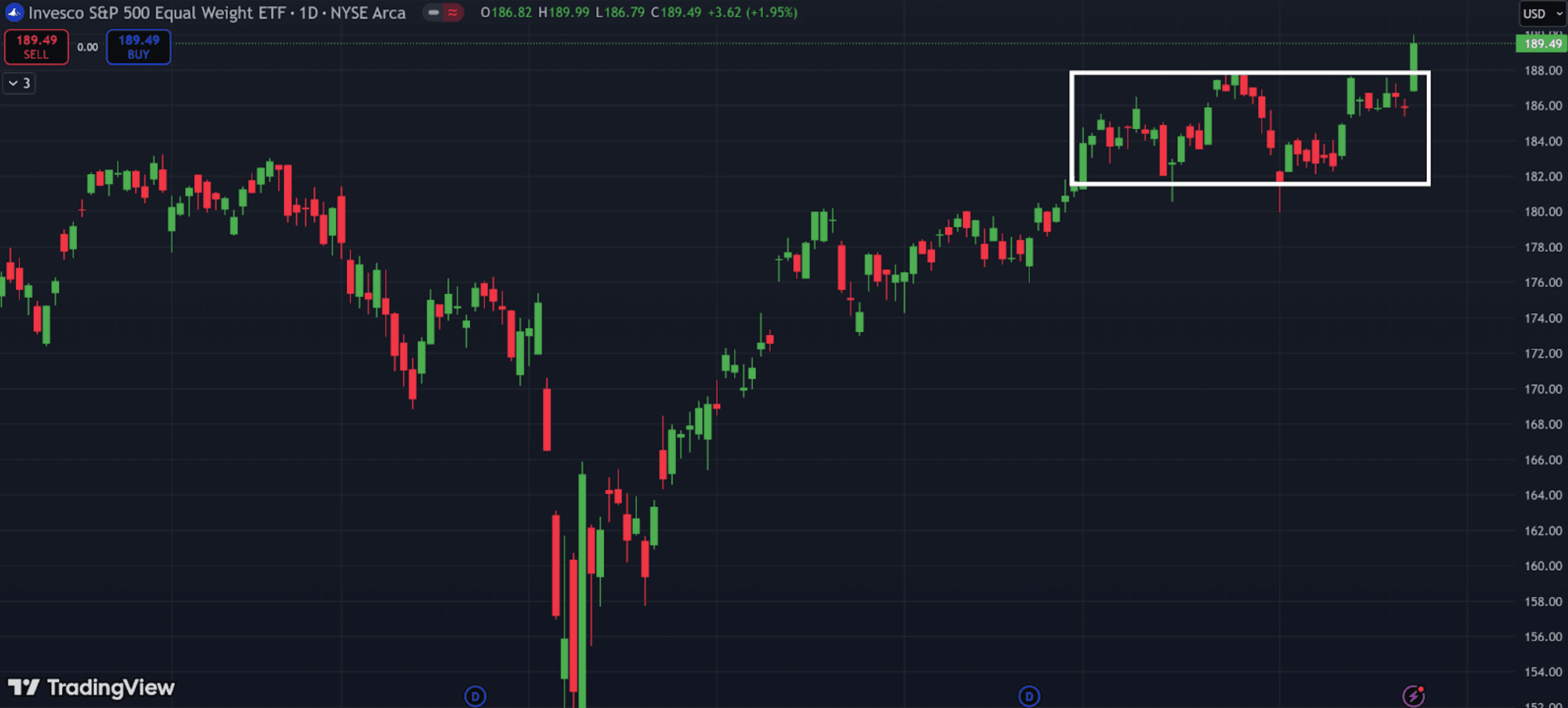 First up is the Equal Weight S&P 500 surging nearly 2% on Friday – breaking out to new all time highs.