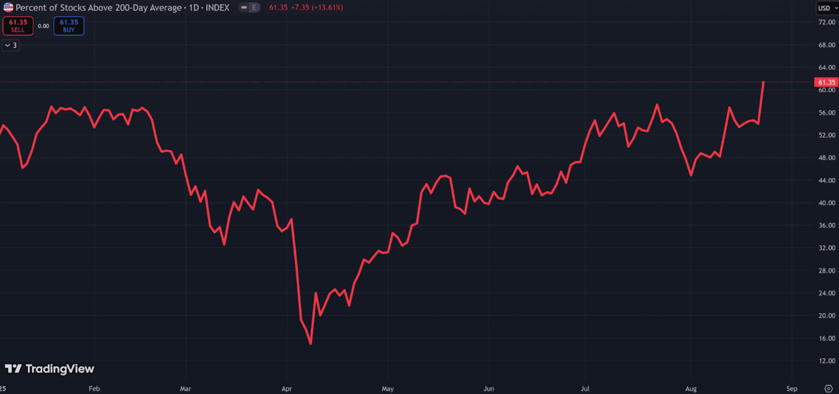 Market breadth readings have also taken a big jump, with the percentage of stocks trading above their 200-day moving average reaching the highest levels this year as well.
