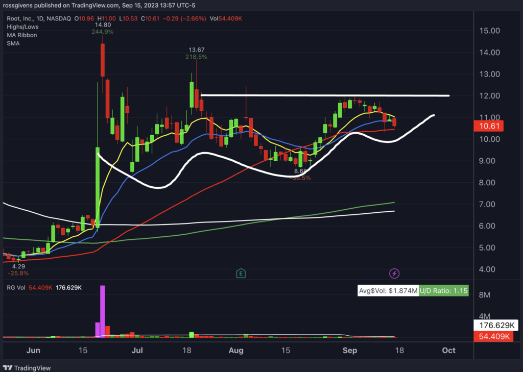 After a series of shallowing retracements which I have highlighted on the chart above, ROOT is setting up for a potential breakout higher.