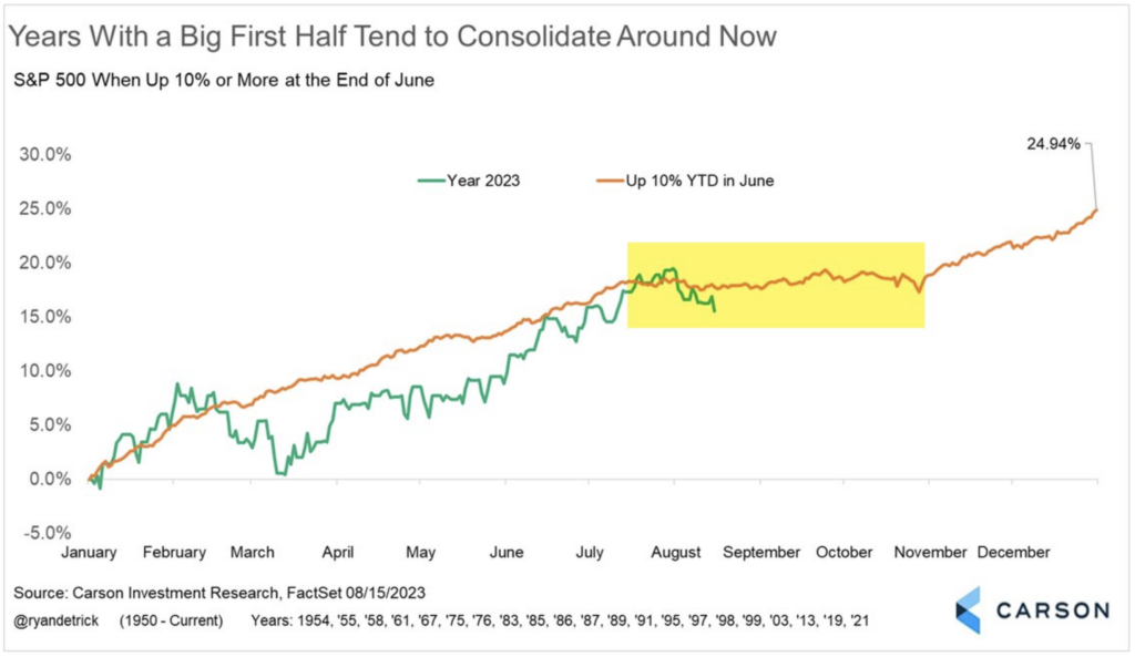 Not counting 2023, there have been 21 years where the S&P 500 was up 10% or more in the first half of the year.