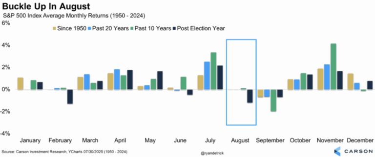 The above chart shows how the S&P 500 has typically performed in August across various time frames as well as post-election years.