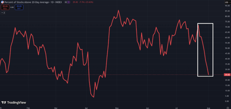 With the percent of stocks trading above their 20-day moving averages (a sign of short-term direction) falling from over 70% to 25%.