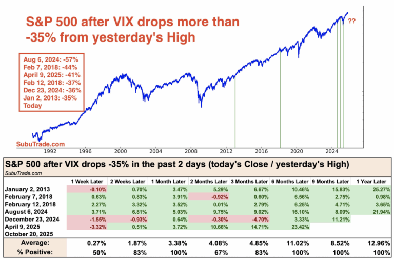 And as the chart above shows, each time the VIX has dropped over 35% from the day before’s high…