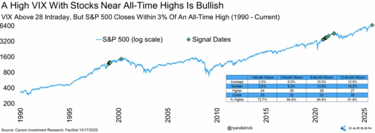 Take a look at this second chart – which shows that the VIX hitting a high above the 28 mark when the market was near all-time highs is also highly bullish.