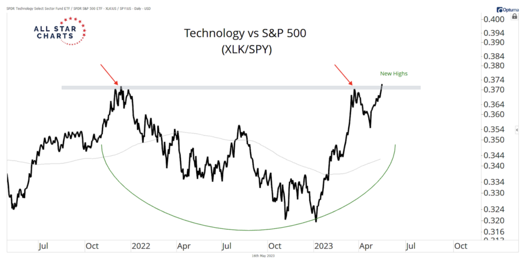 And here’s an interesting “ratio” chart (courtesy of All Star Charts) that cements my view that tech is where we should be looking for breakouts right now.