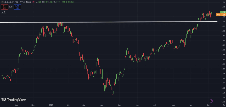 The ratio between the S&P Consumer Discretionary sector and the Consumer Staples sector.