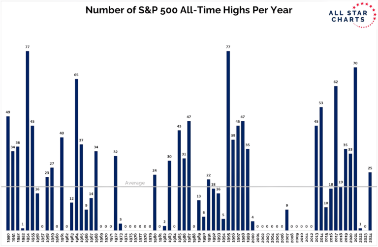 Over 5 months into 2024, the S&P 500 has hit new all-time highs 25 times. That’s a lot – definitely above the average.