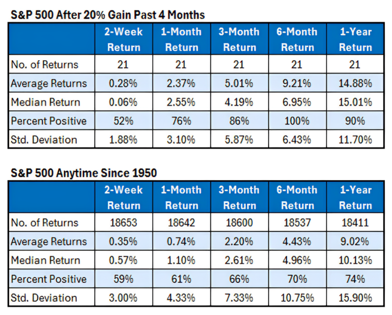 As you can see, in all 21 of the previous instances of the S&P 500 going on a 20% four-month run, its average/median return over the next year is 15%.