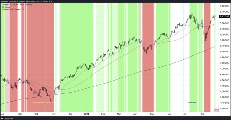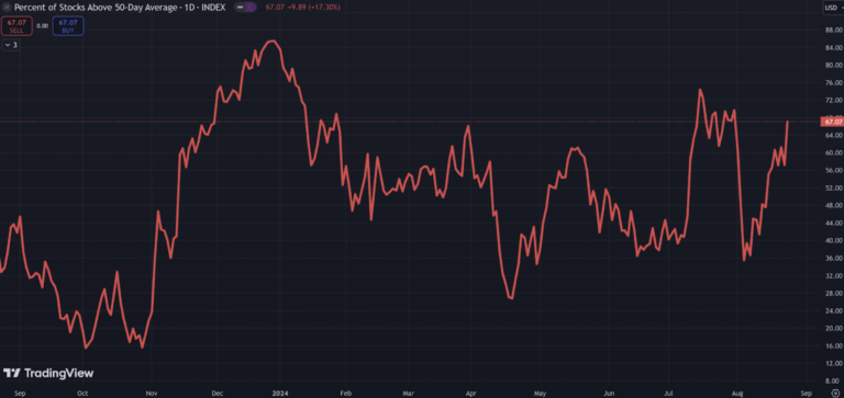 This shows just how strong participation is, which we can confirm by looking at the percentage of stocks trading above their 50-day moving averages…