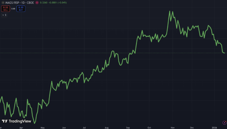 This is MAGS/RSP – the ratio of the Magnificent 7 ETF (MAGS) to the Equal-Weight S&P 500 Index (RSP).
