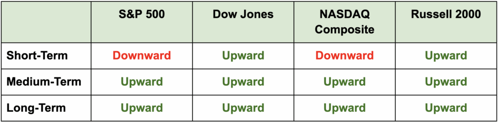 Note: Indexes closed mixed yesterday, with the S&P 500 and the Nasdaq dipping, but the Dow and the Russell 2000 posting a gain. The short-term direction for the Dow flipped back upward.