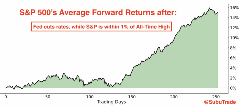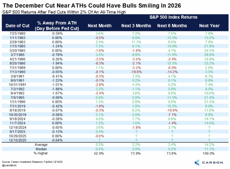 This table shows how the S&P 500 has performed 1 – 12 months after the Fed cut near all-time highs.