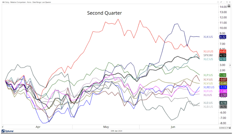 This chart shows how the various sectors – as measured by their respective ETFs – performed over the course of the second quarter.