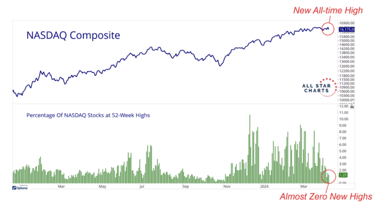 And yet, there were almost zero new Nasdaq stocks hitting new 52-week highs.
